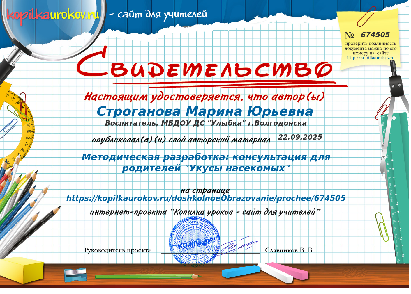 Методическая разработка: консультация для родителей "Укусы насекомых" [Электронный ресурс] // 2025. URL: